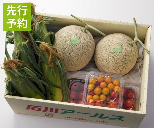1.7~2.2kgの大きめサイズのアールスメロンが2玉と、完熟トマト3パックと、早朝採りとうもろこし5本の組み合わせです。